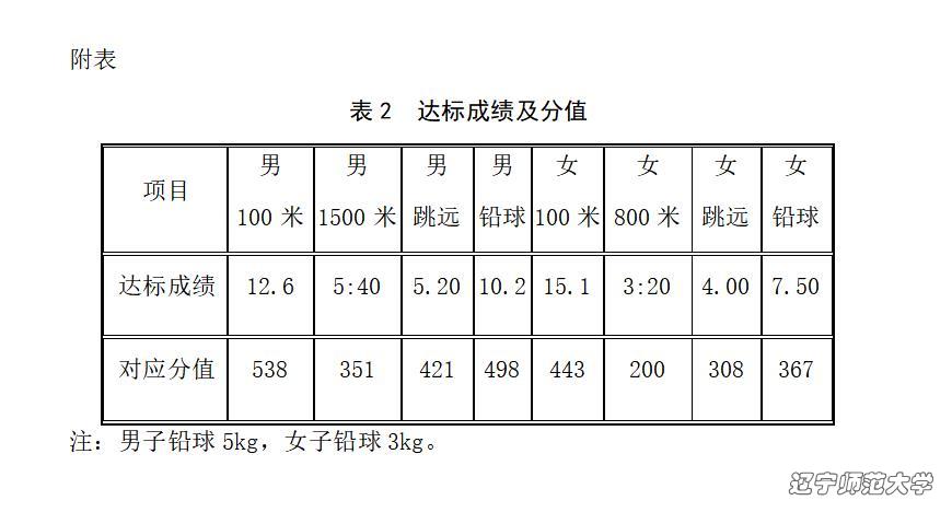 (二)学院对通过资格审核的申请人进行考核,并确定拟接收学生名单。考核内容为:身体素质测试,具体测试项目有100米、1500米(男)、800米(女)、原地投铅球、跳远,要求各单项成绩达标,且总成绩分值男≥1808、女≥1318(单项达标成绩及对应分值见附表,详细成绩对应分值参考《田径项目分值表》,中国田径协会审定,人民体育出版社,2004年第一版)。若考核合格的学生人数未达到拟接收人数,则全部接收;考核合格人数超过拟接收人数,按照身体素质测试成绩排名顺序由高到低确定拟接收学生名单。